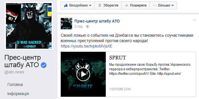Хакерам удалось взломали официальную страницу пресс-центра штаба АТО в Facebook. Страница перешла под их доступ около двух часов назад.