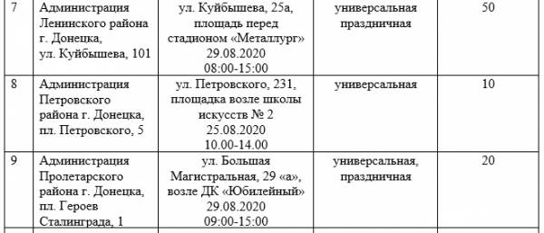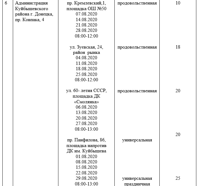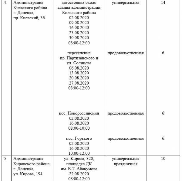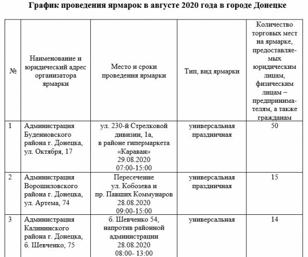 Время чтения: мин. 0 График проведения ярмарок в августе 2020 года в городе Донецке 06.08.2020 График проведения ярмарок в августе 2020 года в городе Донецке Предыдущая статья 6 августа будет временно изменено расписание некоторых пригородных поездов Следующая статья В ДНР подорожал бензин Смотрите также: График проведения ярмарок в июле 2016 года В июне в Донецке проведут более 50 ярмарок Комментарии Информация Посетители, находящиеся в группе Гости, не могут оставлять комментарии к данной публикации. Комментариев еще нет. Вы можете стать первым! Твой Донецк » Справочник Донецка » График проведения ярмарок в августе 2020 года в городе Донецке