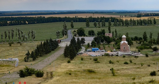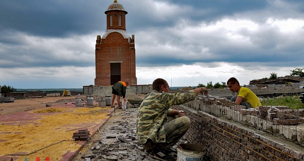Возведение здания часовни завершено у подножия кургана Саур-Могила. Внутри и снаружи каплицы еще предстоит выполнить отделочные работы, в процессе и благоустройство прилегающей территории.
