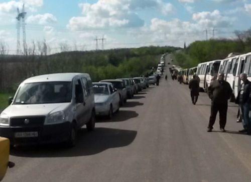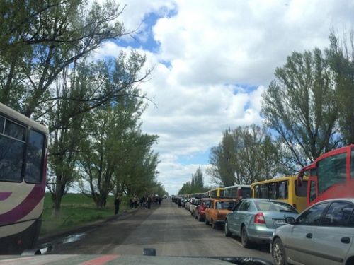 Вчера на блокпосту на выезде из города Марьинка, расположенном на окраине Петровского района Донецка, выстроилась пробка почти из ста машин.