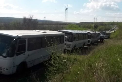 Еще одна огромная пробка из автобусов и автомобилей зафиксирована на блокпосту между Горловкой и Артемовском. По словам людей, время ожидания в очереди составляет три-четыре часа.